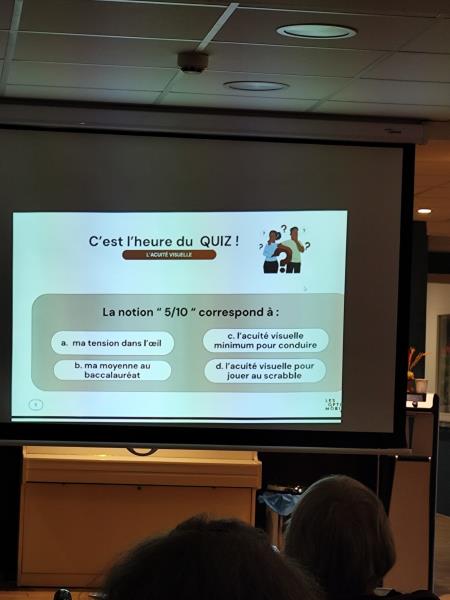 Une présentation de ce métier, qui a beaucoup plus aux résidents, et nous avons pu apprendre différentes choses sur: les troubles de la vue. les pathologies oculaires ( cataracte, glaucome, DMLA ), la prévention ( les signaux d'alerte).Â
