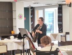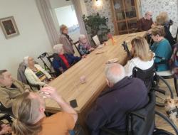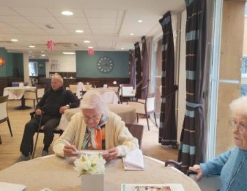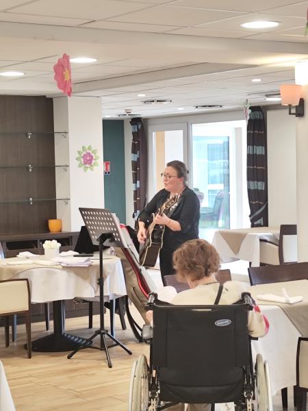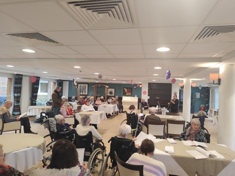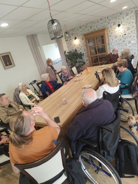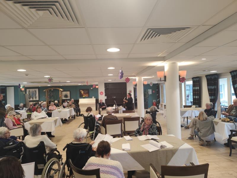 Les Terrasses de Granvelle > Actualités > Dimanche à la résidence Dimanche à la résidence Publiée le 16/03/2026 Hier nous avons pris l'apéritif à midi ( avec un bon levé de coude pour certains comme vous pouvez le voir😂) et ensuite chants avec Laurence.😍